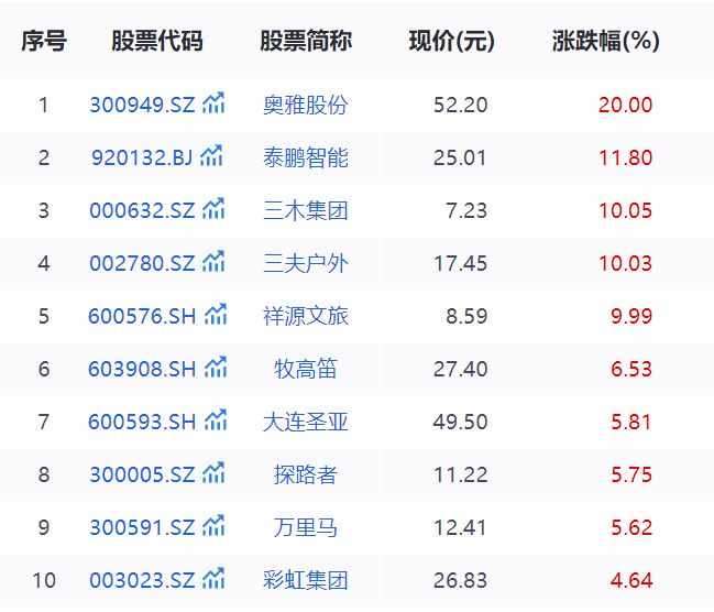 11月13日午盘,户外露营概念异动,三夫户外直线涨停,牧高笛、探路者、嘉麟杰、泰鹏智能、浙江自然等冲高。 消息面上,近期,张家界七星山荒野求生赛事火爆全网,选手们的艰难求生经历和顽强精神引发热议。英国著名探险家、荒野求生专家贝...